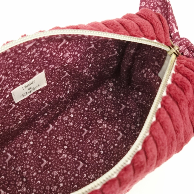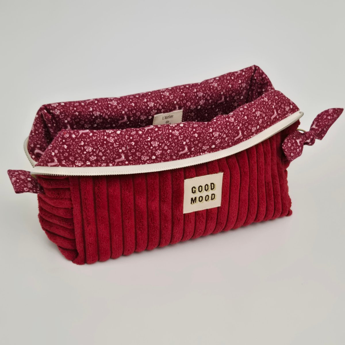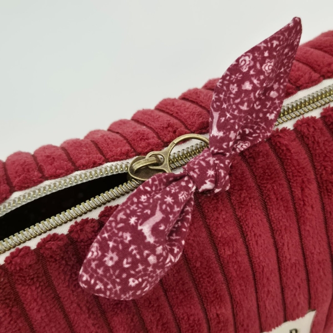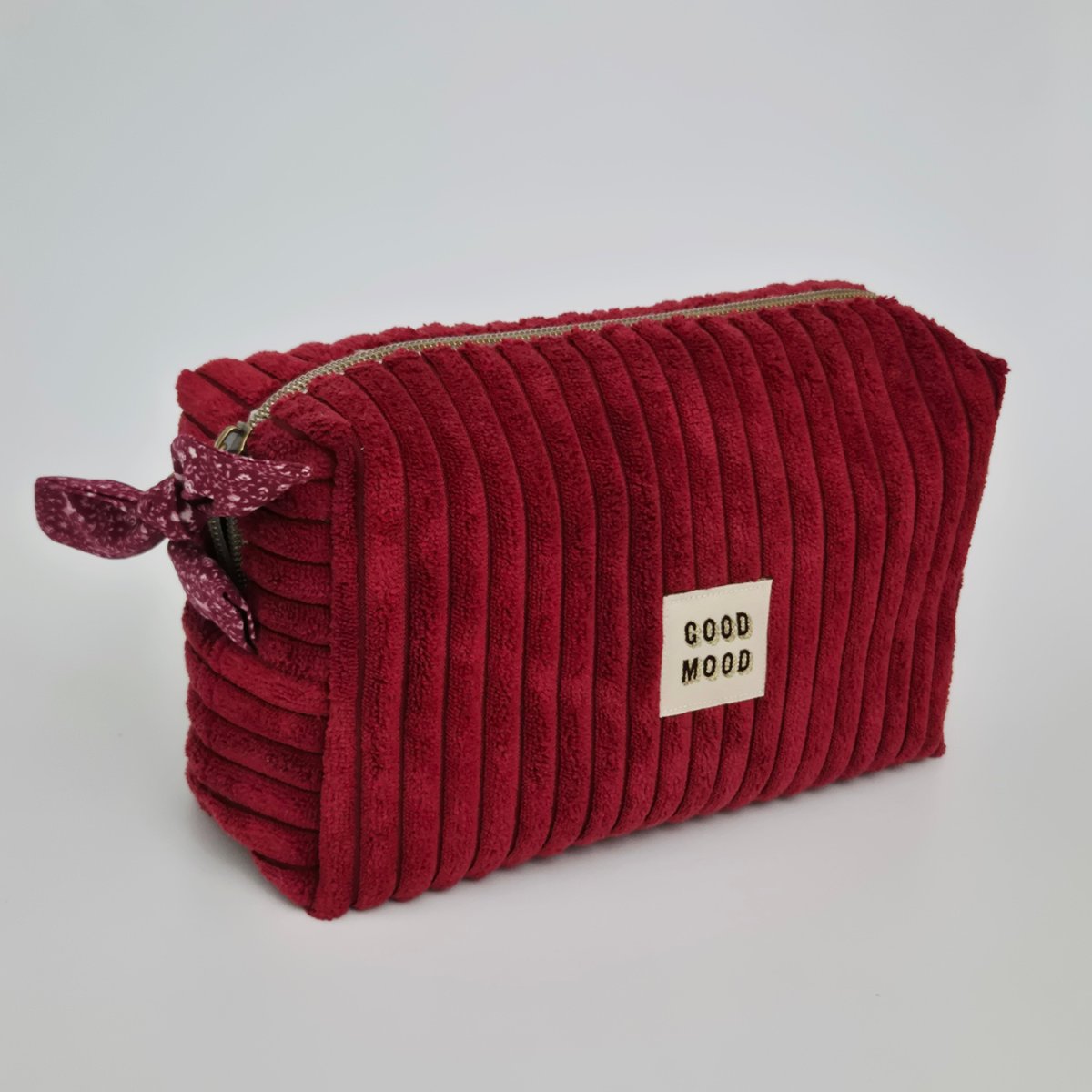 Grande trousse en velours Soraya, faite à la main avec soin. Ce modèle de trousse en velours possède des côtes larges pour un look élégant et intemporel. À l'intérieur, vous trouverez un doux tissu en coton pour protéger vos objets personnels.