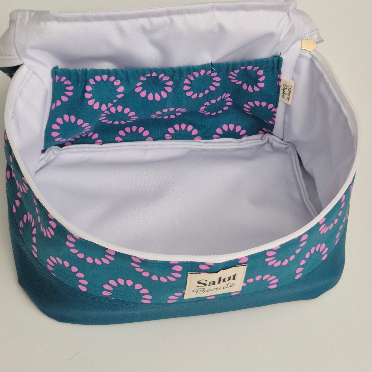 L’intérieur est doté d’une double poche plaquée permettant d’organiser vos produits avec soin. Son zip doré apporte une finition lumineuse et sophistiquée, soulignant le caractère précieux de cette pièce artisanale.